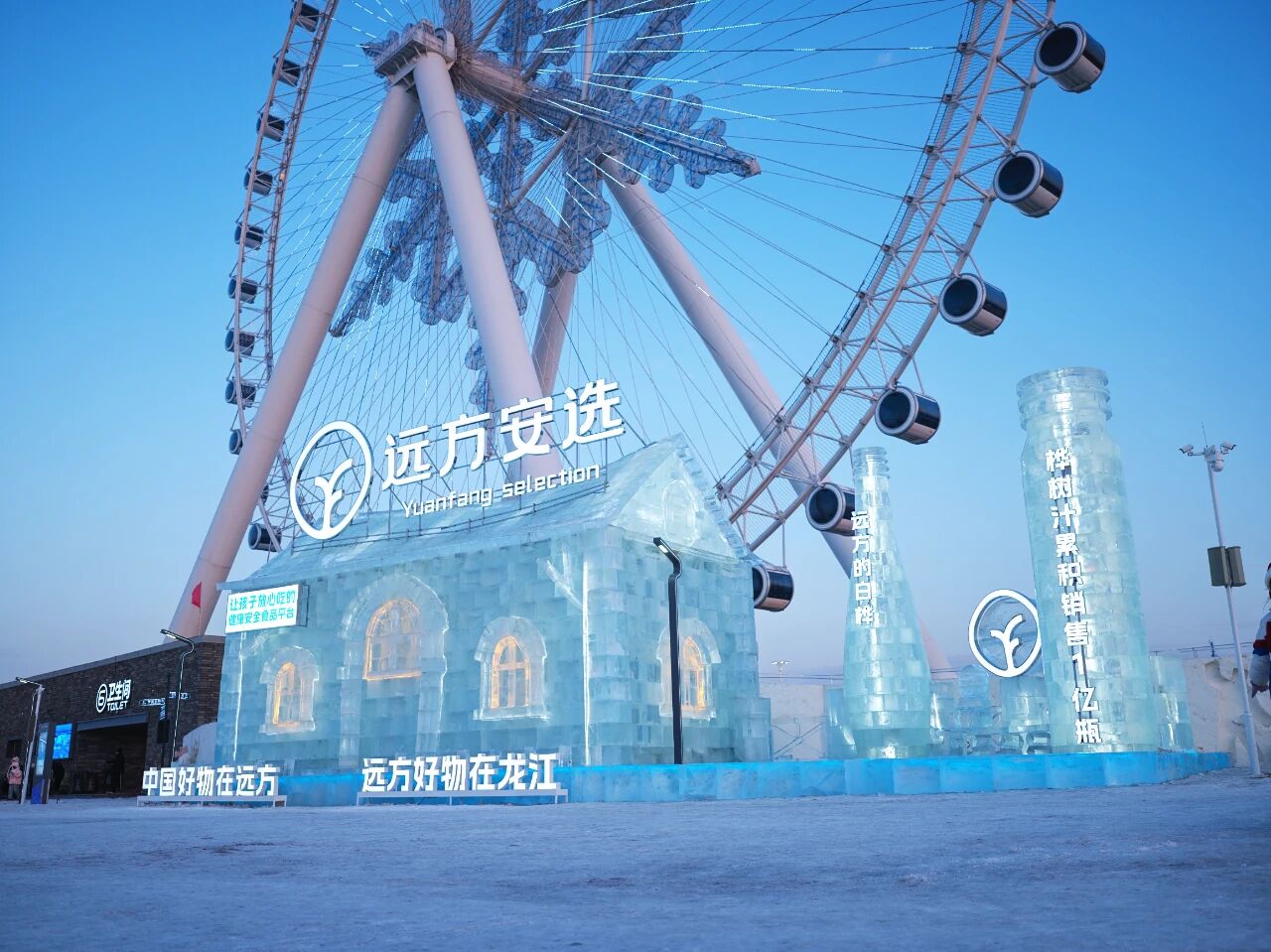 远方好物以匠心独运的设计,将品牌基因注入北国冰雪。高达数米的冰雕主体由纯净冰体精雕细琢而成,“远方安选”字样如钻石般镶嵌于冰面,象征对品质生活的坚守;环绕其间的桦树汁瓶造型冰雕,则流淌着源自森林的自然馈赠,传递“健康溯源”的品牌初心。夜幕降临时,冰雕内部灯光渐次亮起,蓝白光影交织成梦幻星河,与漫天飘落的雪花共舞,成为游客镜头下的“必打卡点”。
