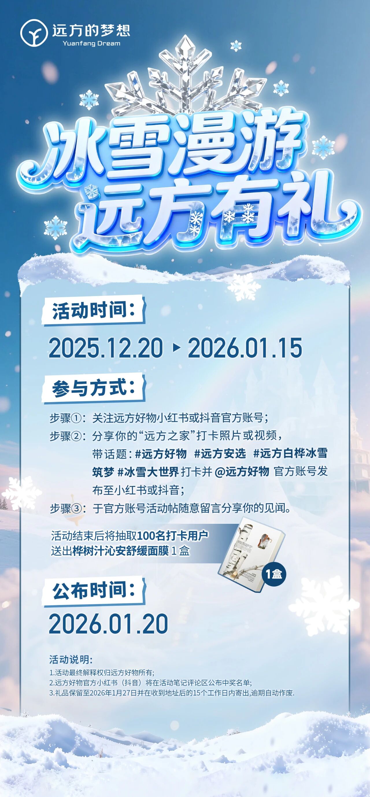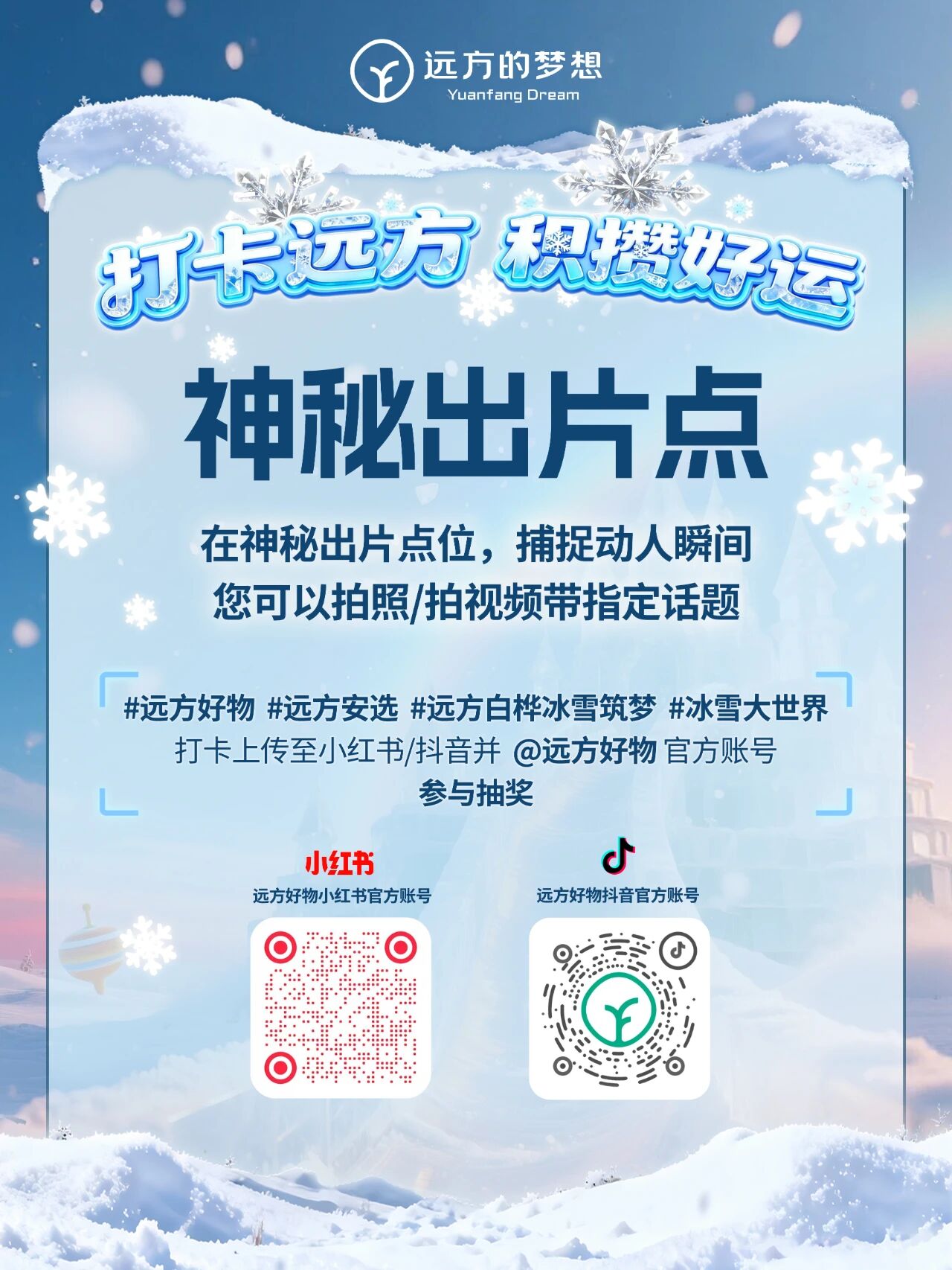 步骤②:分享你的“远方之家”打卡照片或视频,带话题:#远方好物 #远方安选 #远方白桦冰雪筑梦 #冰雪大世界打卡 并 @远方好物官方账号,发布至小红书或抖音