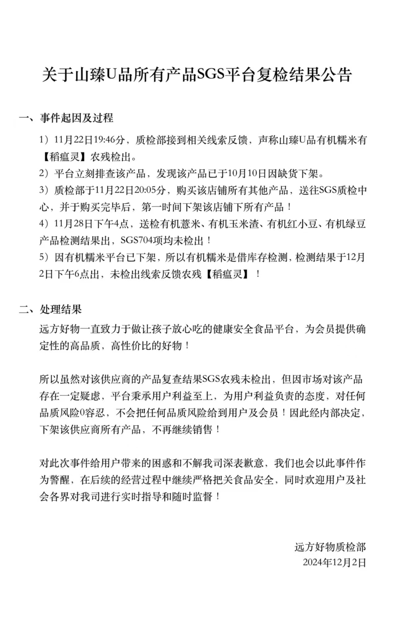 关于山臻U品所有产品SGS平台复检结果公告